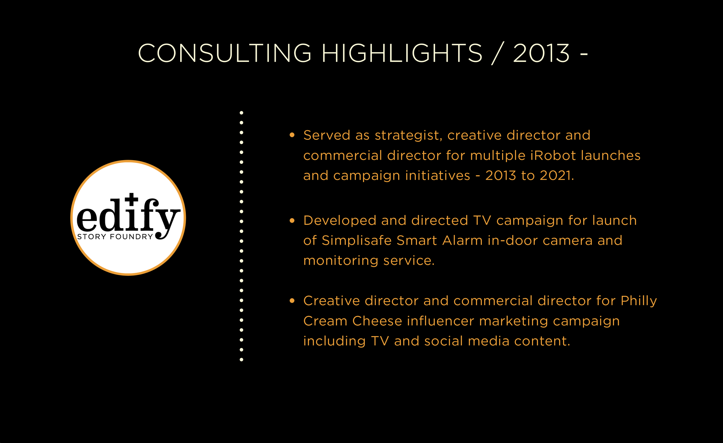 By packaging my experience in a consultancy model, I’m able to offer clients a fresh, unencumbered perspective. Edify Story Foundry sits at the intersection of all three of my passions: strategy, creativity and filmmaking. When I’m writing strategy, I’m thinking about how it can guide the creative. When I’m developing creative, I’m also considering how it impacts the production in terms of technique and budget. And as a director, I love shaping ideas into engaging storytelling using all the filmmaking tools at my disposal. The result is a more seamless, more efficient brand-building process. Now I work directly with companies and organizations, helping them discover their inner brand.