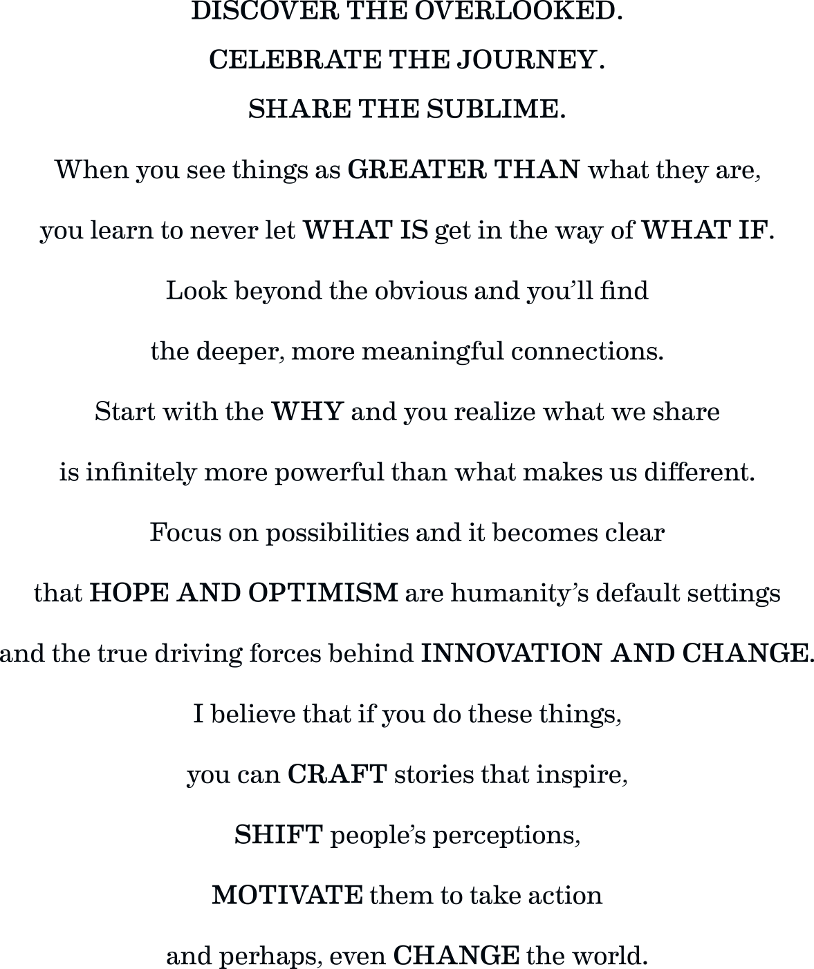 I decided to leave at the height of my career in 2013. It was less to do with the agency itself and everything to do with the industry as a whole. After 20+ years in the business, I believed there was another way to craft richer, more impactful brand stories. It also aligned with the growing importance of video, the democratization of filmmaking and increasing client desire for new approaches to old problems. I had been helping companies identify their values and follow their true purpose. I realized it was time for me to do the same.